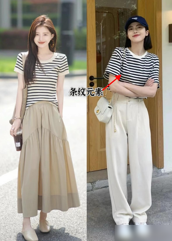 条纹T简直是夏日的点睛笔,蓝白或黑白配色清爽不花哨,视觉层次丰富还显瘦,搭条开衩牛仔裙或直筒裤,走路带风自带高级感。
